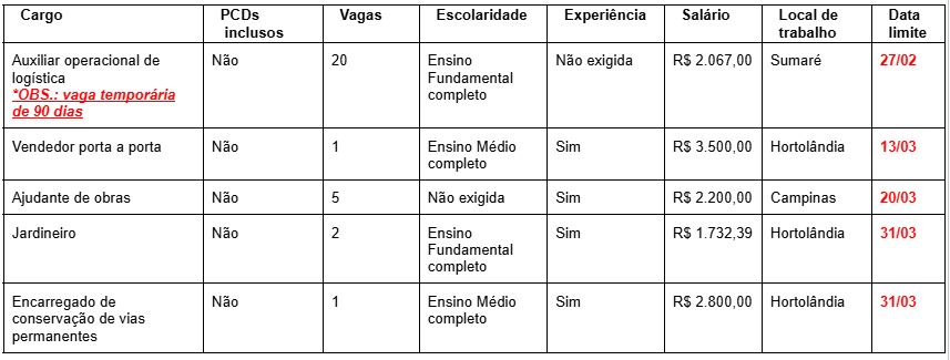 O PAT de Hortolândia reforça que as vagas ficam disponíveis até as datas limites, ou até os limites de candidatos estabelecidos pelos empregadores forem atingidos.